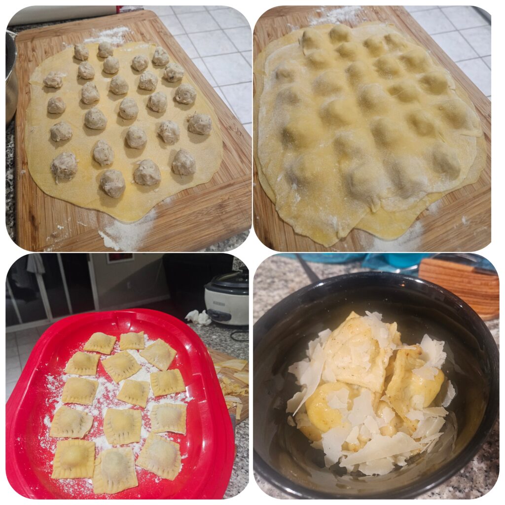 I decided to make a spin on a ravioli/pierogi. I used the ravioli dough, but the filling was more of a classic pierogi filled with potatoes. I boiled and mashed the potatoes and added the same ingredients you would for traditional mashed potatoes (milk, butter, salt, pepper). I sauteed some shallots and fresh garlic; mixed in, and then added finely chopped cooked turkey meat. It all came together nicely, and honestly, this would have been a great ‘one pan dish’ using Thanksgiving leftovers..